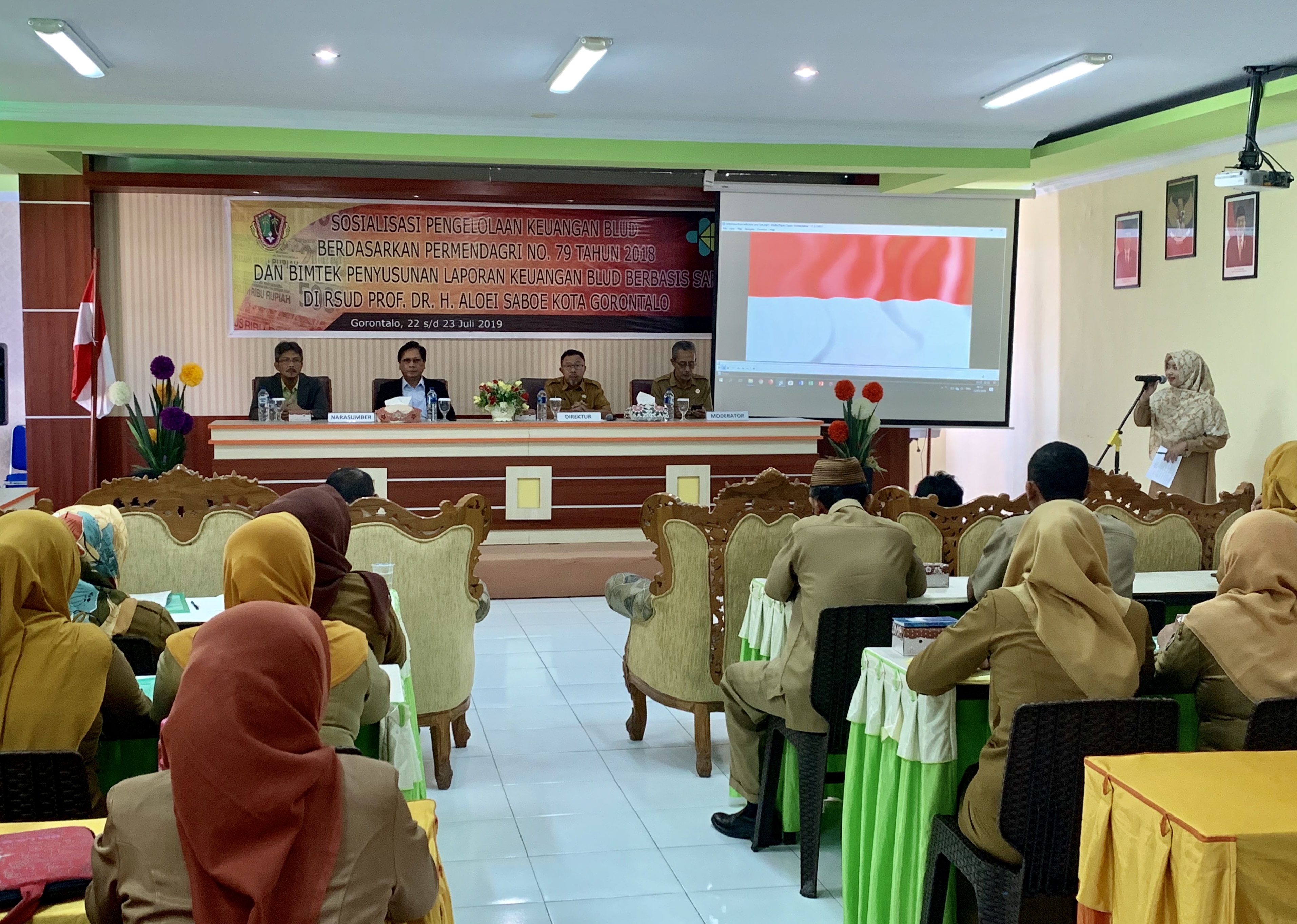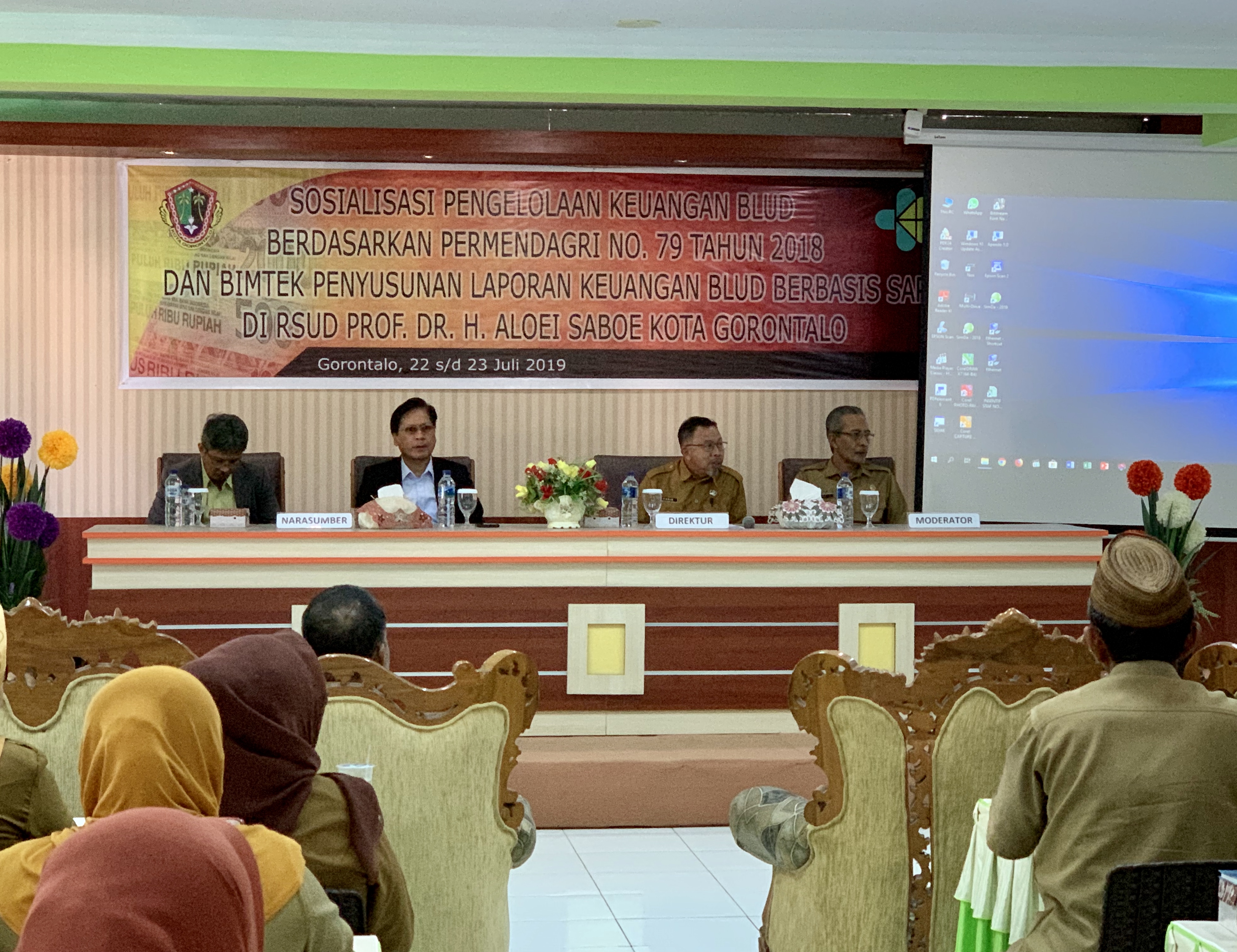 Sosialisasi pengelolaan keuangan BLUD berdasarkan Permendagri No.79 dan Bimtek Penyusunan laporan keuangan berbasis SAP yang dilaksanakan selama 2 hari yaitu tanggal 22-23 juli 2019 di aula lantai II RS Aloei Saboe yang dihadiri oleh pengelola keuangan baik dari RS Aloei Saboe, RS Ainun Habibie, Inspektorat Maupun dari Badan Keuangan Kota Gorontalo.